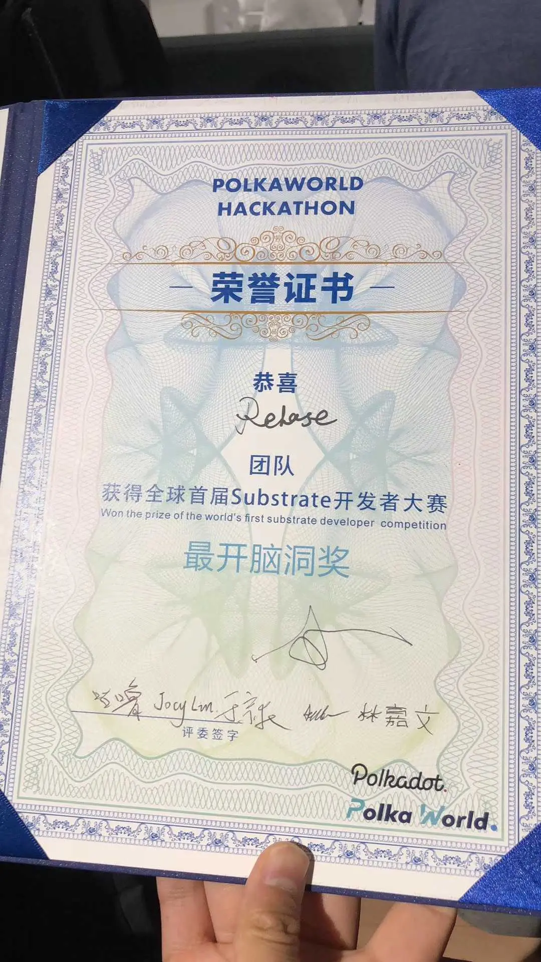 在 2019 年 9 月 21-22 日杭州举办的 Substrate 开发者大赛中,Rebase 战队的参赛项目《Merged mining with Substrate》(利用 Substrate 进行联合挖矿)获得了最开脑洞奖,并获得了 5000 元奖金。